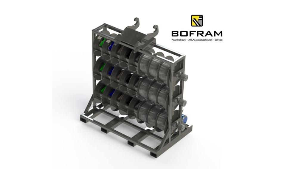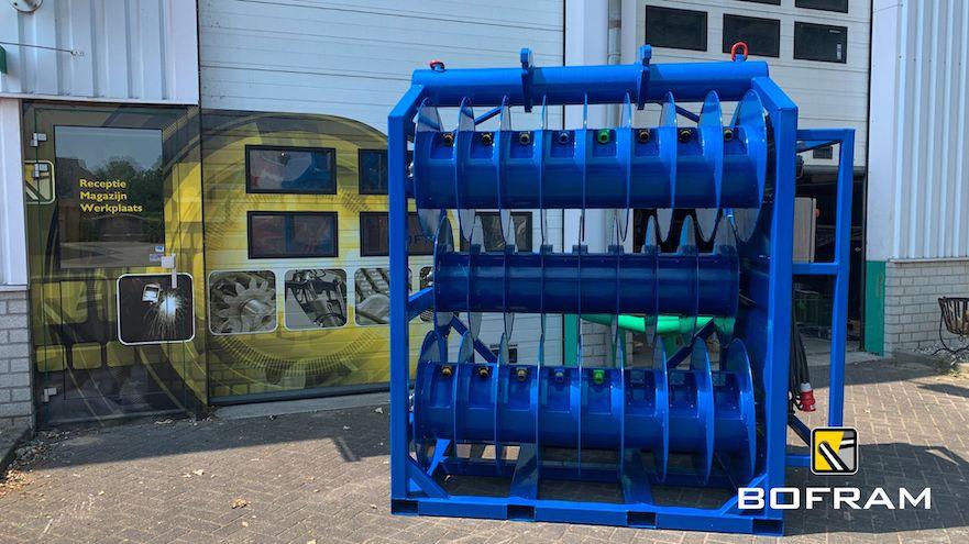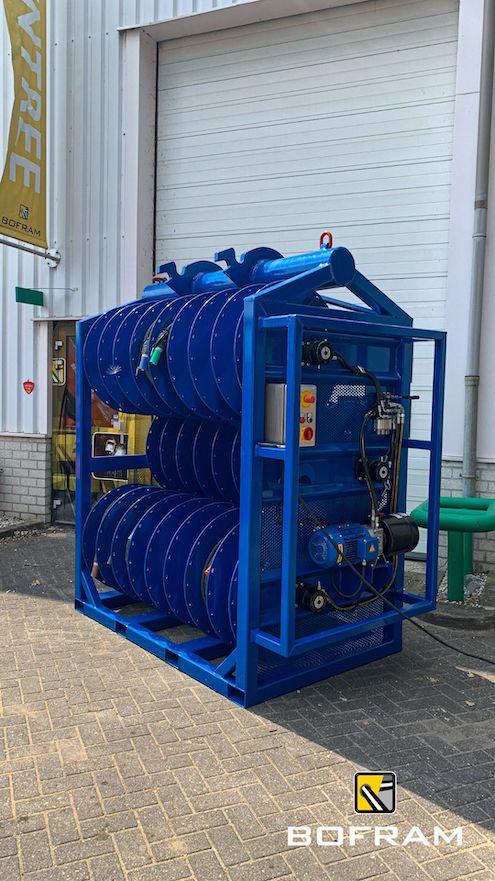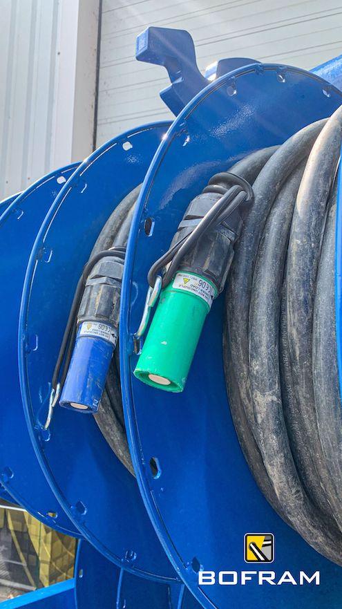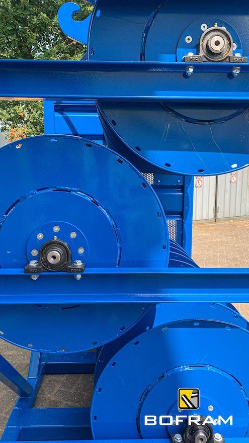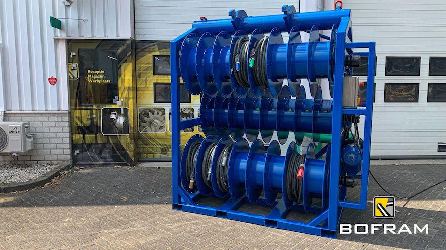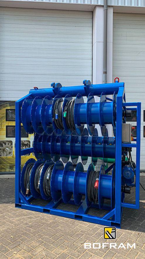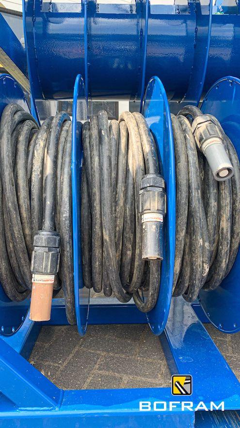 When drilling horizontally or vertically with an electric drilling system, you need numerous power cables. Besides the many advantages of electric drilling, the jumble of power cables is a disadvantage. Therefore, Bofram Techniek has built a cable reel system on a cable reel rack.