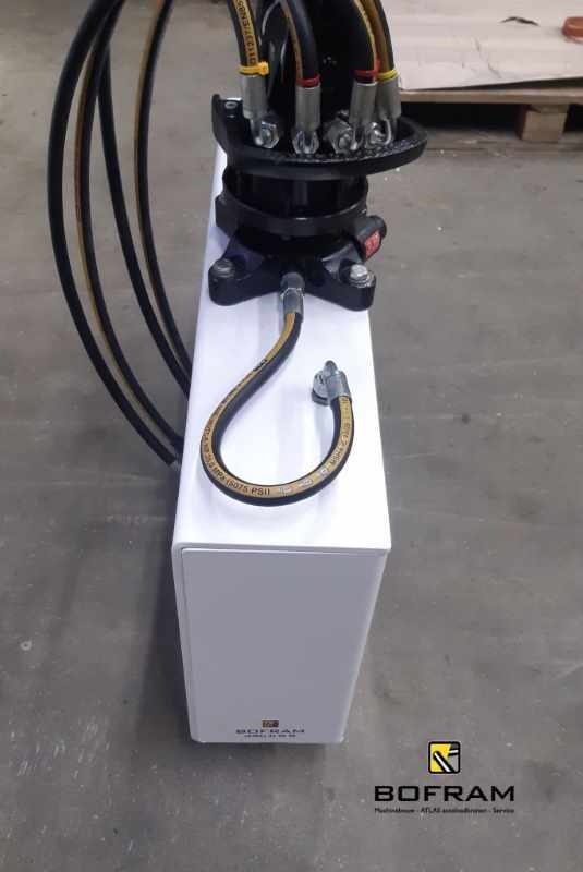 This compact drill rod clamp with rotator is narrowly constructed so it can easily pick up any drill rod from the crate. This drill rod clamp is suitable for use with a crane that has two extra hydraulic functions. The first extra function is needed to clamp the drill rod and with the other extra function you can operate the rotator so the drill rod can be rotated in the desired position.
