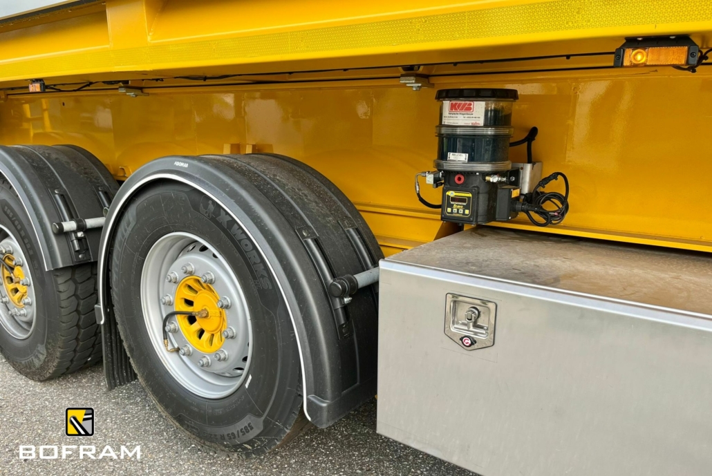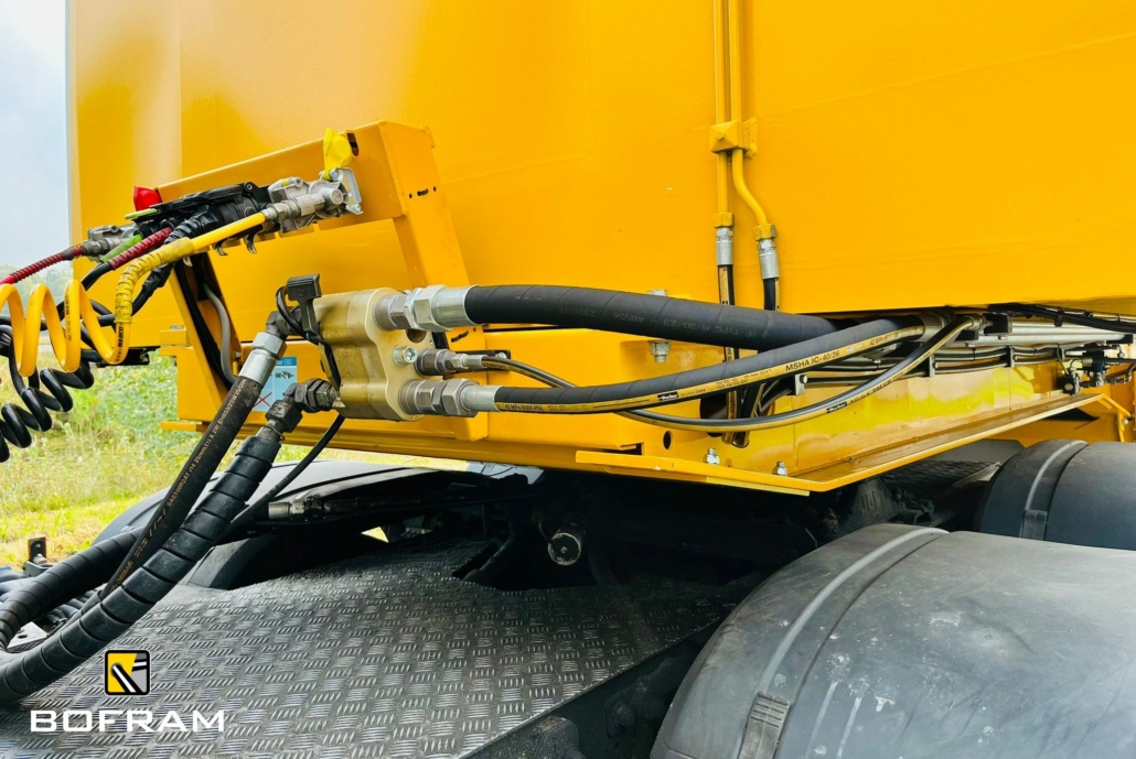 There is an extra platform mounted around the crane foot, this makes it easy to get in and out. Furthermore, there is a quick coupling/multi-coupling system mounted to the trailer, for easy and leak-free coupling and uncoupling. There is also a central lubrication system on the crane.