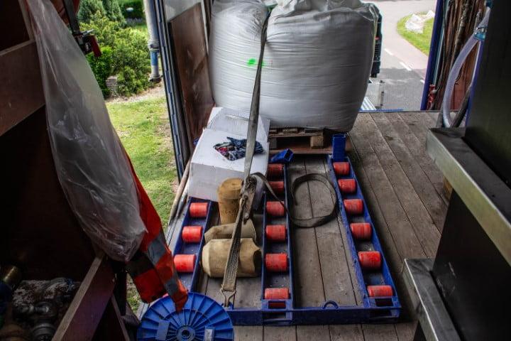 A big water reservoir is present underneath the wooden floor of the trenchless drilling vehicle, so the drilling team always has enough water to their disposal. The 400 L/min bentonite mixing and pumping installation is equipped with a vacuum system and hydraulic reel. There is also a heated canteen in the drilling vehicle, so the team is not dependent on external facilities on location.