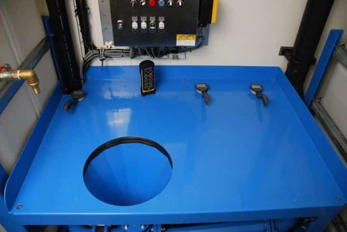 | Opties | ● Mixen en hoge druk pompen onder belasting gelijktijdig te gebruiken ● Op maat gemaakt voor een laadbak waarin ook de boormachine te plaatsen is ● Hydraulische aandrijving op PTO van truck, vast dieselmotor toerental ● Draadloze afstandsbediening met Drukaflezing en Liters per minuut ● Hydraulisch aangedreven slang haspel 50 meter met 1 1/4” hoge druk slang ● 3x 3000 liter tank voor de voorraad van schoonwater, gemixt product en mix-tank. ● Niveau meting mix tank zodat de mix pomp automatisch stopt bij laag niveau ( laag niveau beveiliging). ● Niveau meting voorraad tank zodat de HD pomp automatisch stopt bij laag niveau ( laag niveau beveiliging). ● Hoge druk pomp te gebruiken i.c.m. schoonwater pomp om de machine te reinigen ● KSB mix-pomp met mechanische afdichting |
