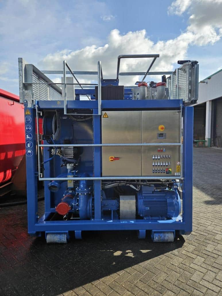 De recycling unit is uitgerust met drie Mission Short Frame pompen, die bekleed zijn met een geharde Nedox coating. Dit betekent dat de pompen tot wel 3x langer meegaan en dat de pomp en motor op een kortere afstand van elkaar zijn gemonteerd in vergelijking met traditionele pompen. Bovendien, is de unit uitgerust met PE100 leidingen die beter bestand zijn tegen zand dan stalen leidingen. De recycling unit is ook uitgerust met een shale shaker en twee mud cleaners met high flow hydrocyclonen. De vervuilde mud/bentoniet wordt in drie stappen schoongemaakt, waarbij de vervuilde mud binnenkomt via de shale shaker, vervolgens wordt deze over de eerste mud cleaner gepompt en ten slotte herhaalt deze stap op de tweede mud cleaner. De schone vloeistof komt vervolgens terecht in de storage unit.