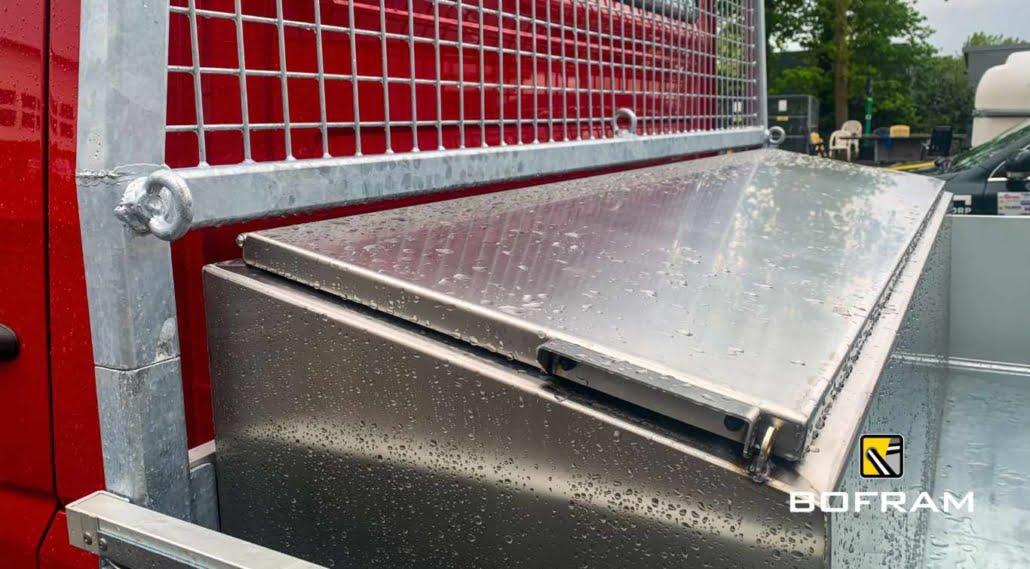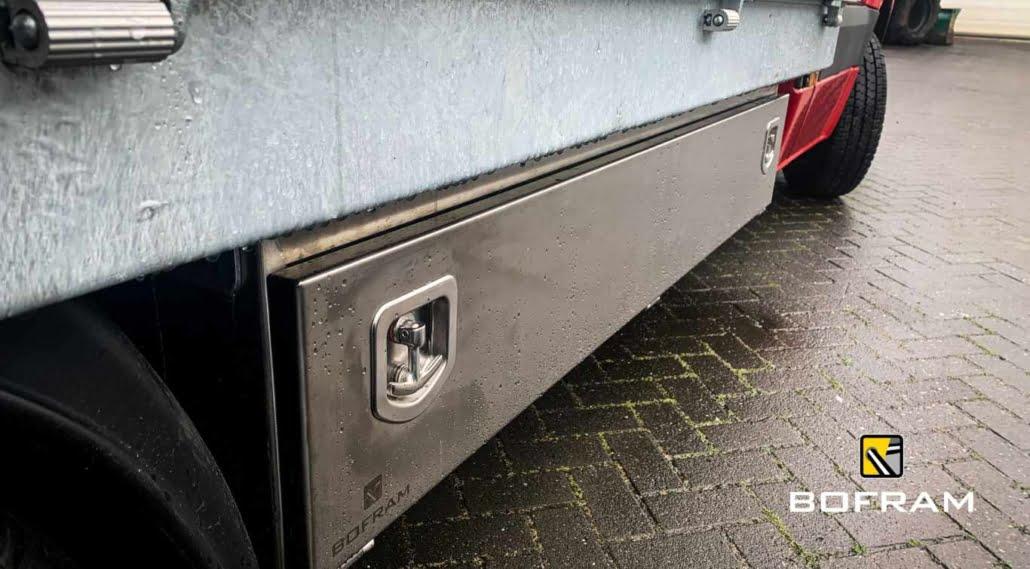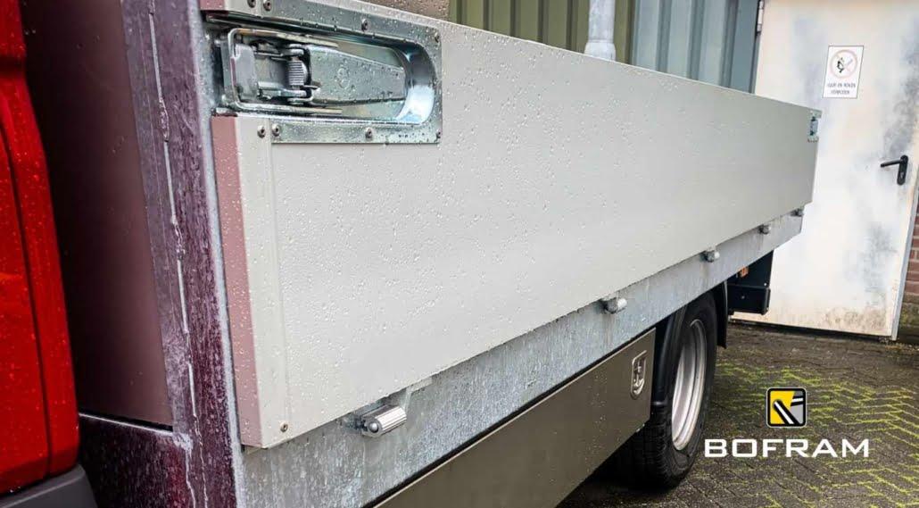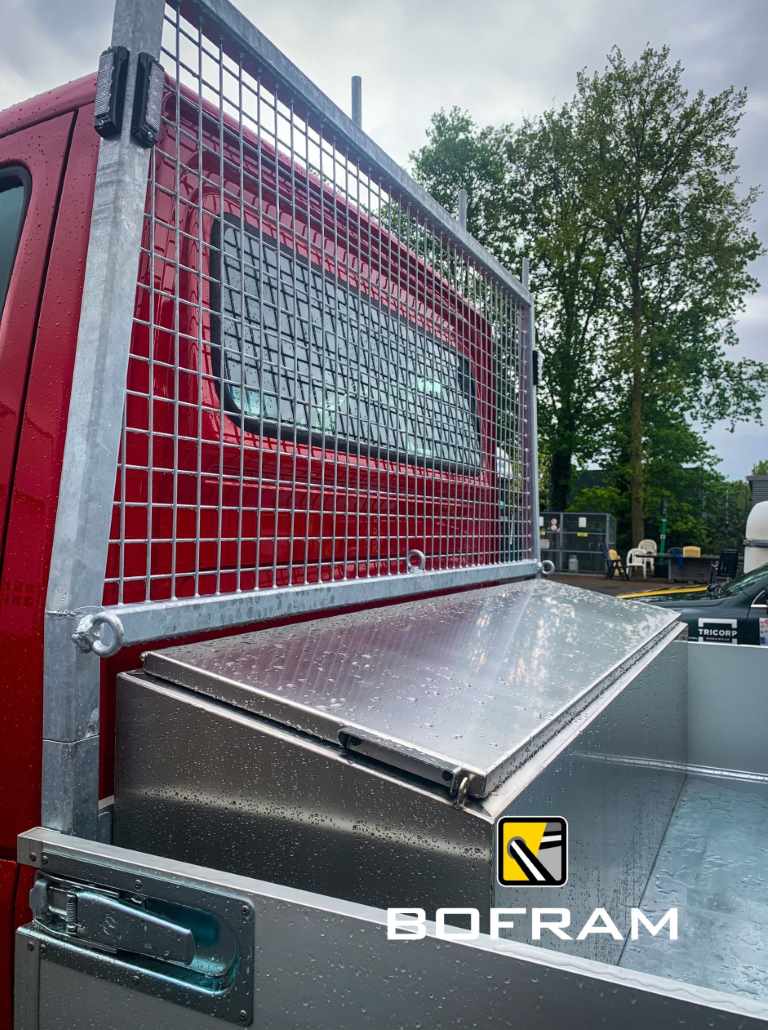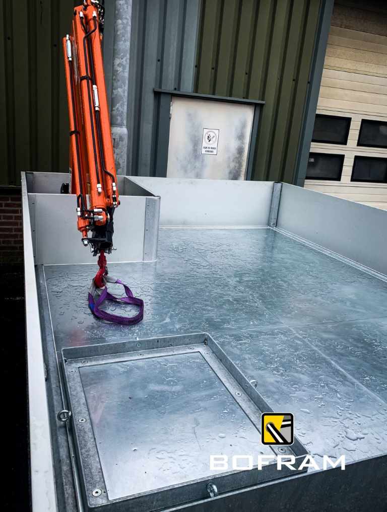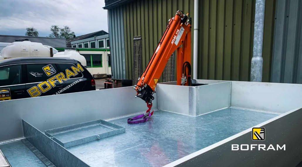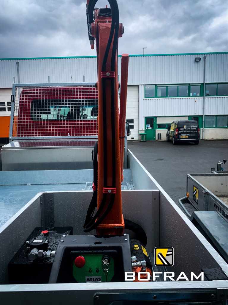 Deze week wordt weer een leuk project opgeleverd; namelijk een laadbak met Atlas kraan. De laadbak is op maat gemaakt en heeft een verzwaarde achterzijde t.b.v. de kraanvoet (met beschermplaat) in de laadbak. De bediening van de Atlas T18 bevindt zich ook achter deze beschermplaat. Verder heeft de laadbak zijborden (400 mm hoog) met zware sluitingen, RVS kisten aan de zijkant van de wagen en een RVS kist in de laadbak. Net boven de cabine bevindt zich een palenjuk met opstaande houders voor PVC buizen. Tussen het palenjuk zit een gaasrekwerk en op de onderste ligger van het palenjuk bevinden zich 3 sjorogen. Deze kraanopbouw is ook voorzien van flitslampen, zijafscherming, en zijverlichting (volgens RDW richtlijnen). De kraan wordt aangedreven door een PTO hydrauliek pomp onder de wagen. Verder zit er een hydraulische afstempelcilinder onder de laadbak en de hydraulische afstempeling zit vast gemonteerd onder kraanvoet.