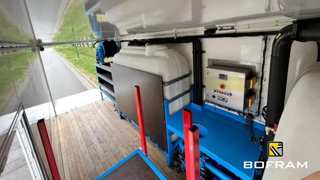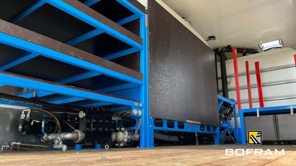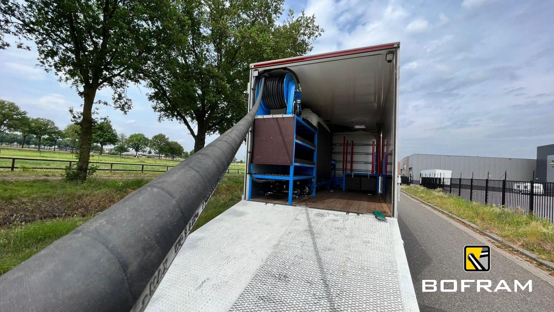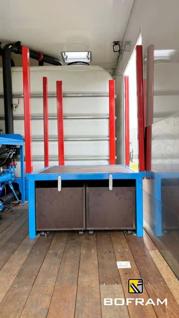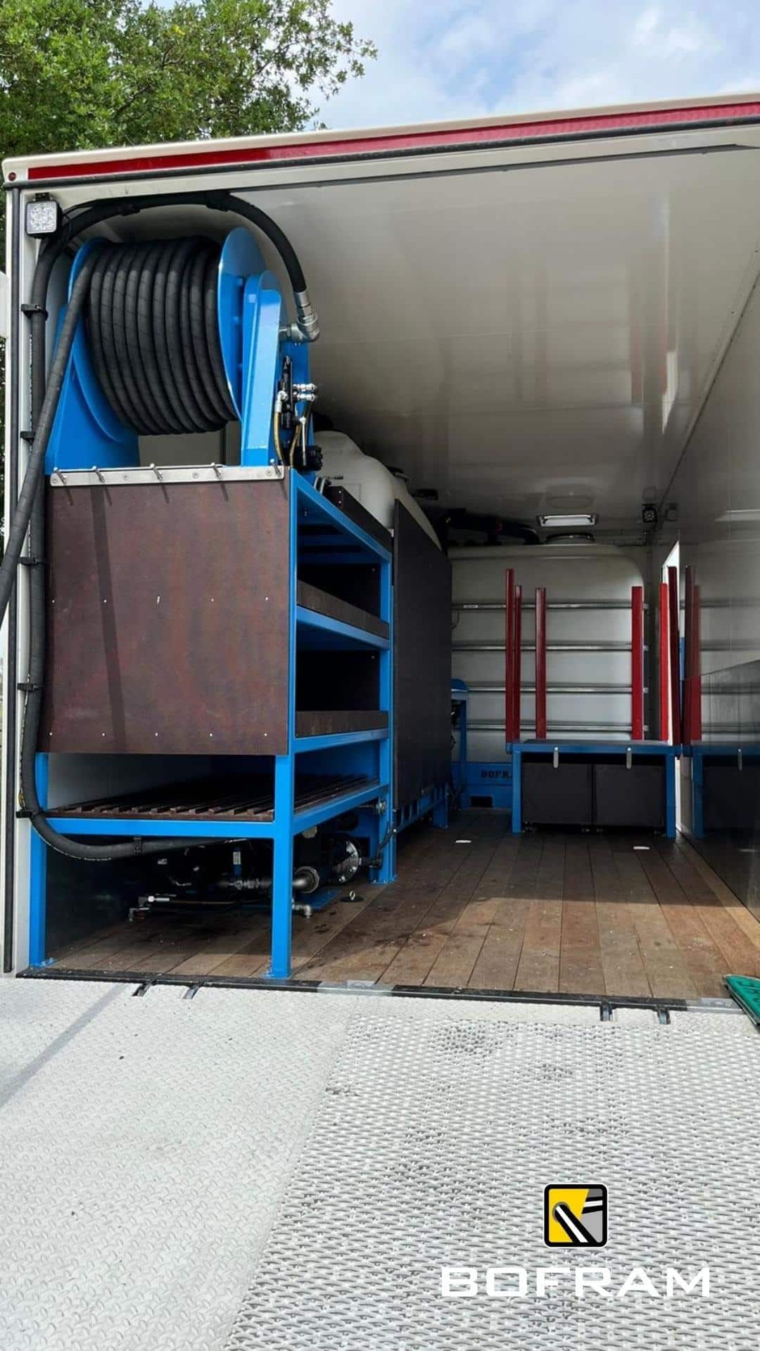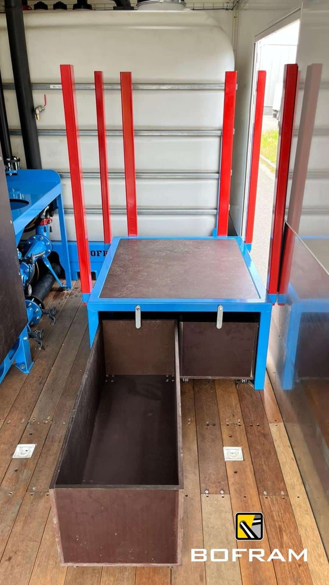 De vorige opbouw boorwagen met HDD mixunit voor Dekabo had ongeveer dezelfde indeling als deze. De boorwagen heeft aan de zijkant zijn mixtank, de hoppertafel, de besturingskast en een opbergkast met haspel. De haspel met bentoniet slang kan gebruikt worden om de boormachine te voorzien van bentoniet. Wat vrijwel meteen opvalt is de plaat die tegen de mixtank is gemonteerd. Hier zal specifiek gereedschap aan opgehangen worden. Zo neemt het weinig ruimte in en is het altijd binnen handbereik. Achterin de boorwagen is de voorraadtank met water te vinden. In de overige ruimte hebben wij een los frame gemaakt met lades. Op het frame kan een pallet met bentoniet geplaatst worden en in de lades nog overig gereedschap. Zelf dan is er nog steeds plek voor de boormachine zelf. Op deze manier is alle ruimte in de boorwagen optimaal gebruikt.
