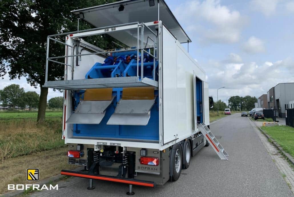Daarnaast beschikt de installatie over een hydraulisch uitklapbaar bordes aan de achterzijde, wat het wisselen van de zeven en het onderhoud vergemakkelijkt. De hydraulische steunpoten zorgen ervoor dat de installatie altijd stabiel op de ondergrond staat.